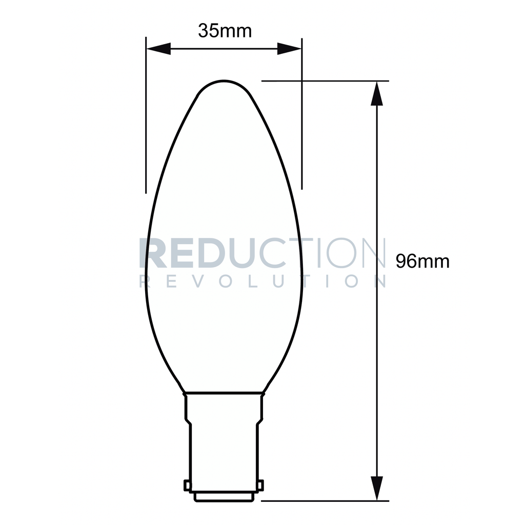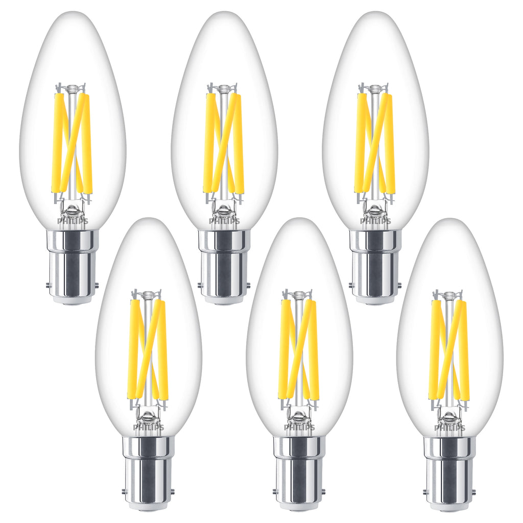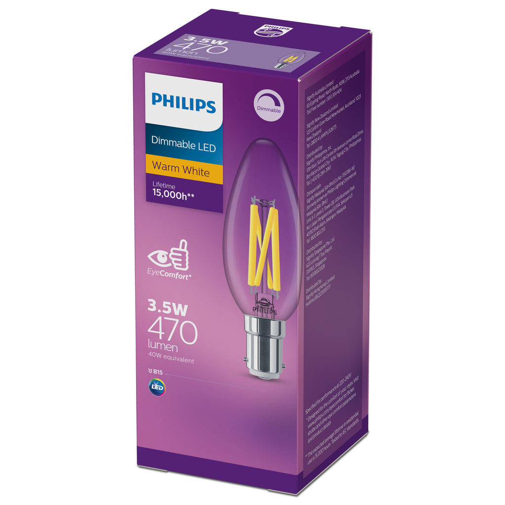 The Philips B15 candle bulb is a quality replacement for Small Bayonet Cap (SBC) lamps. These dimmable, clear filament bulbs suit both open and covered fixtures. Each globe is 3.5cm wide and under 10cm in length. Key features include: