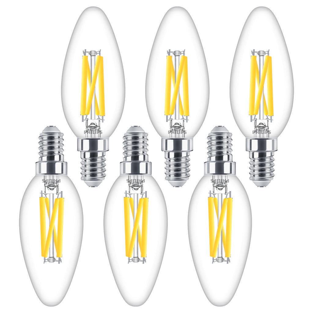 The Philips E14 candle bulb is a reliable replacement for Small Edison Screw (SES) lamps. These dimmable, clear filament bulbs fit both open and covered fixtures. Each bulb measures 3.5cm wide and under 10cm tall. Key features include: