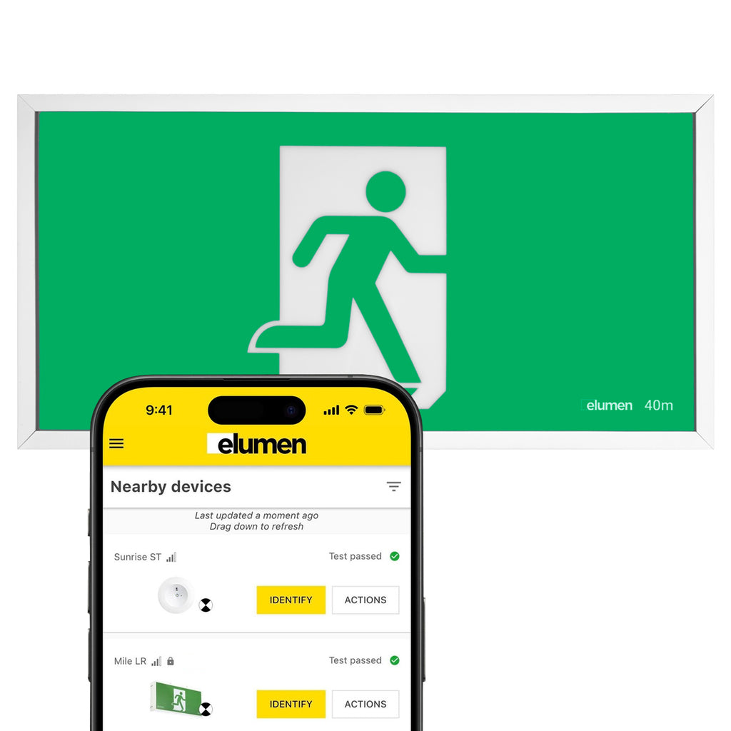 - Easy set-up and data collection. Each 40m exit sign connects to the Elumen app via bluetooth. Simply walk past each light to gather results. The app includes a floor-plan integration and exportable Annual Fire Safety Statement (AFSS) reports.