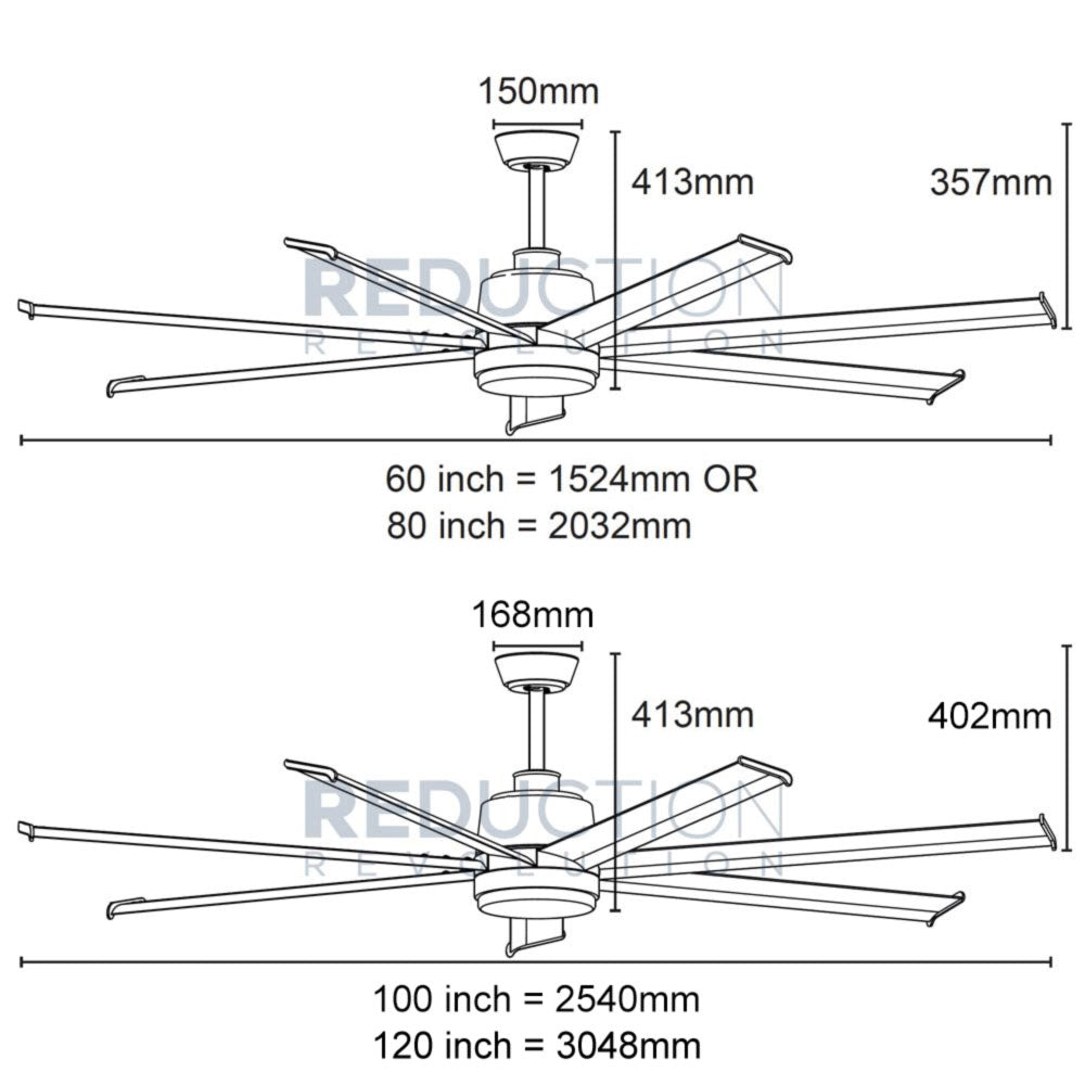| Blade diameter | 60 inch (152cm), 80 inch (203cm), 100 inch (254cm) or 120 inch (305cm). |