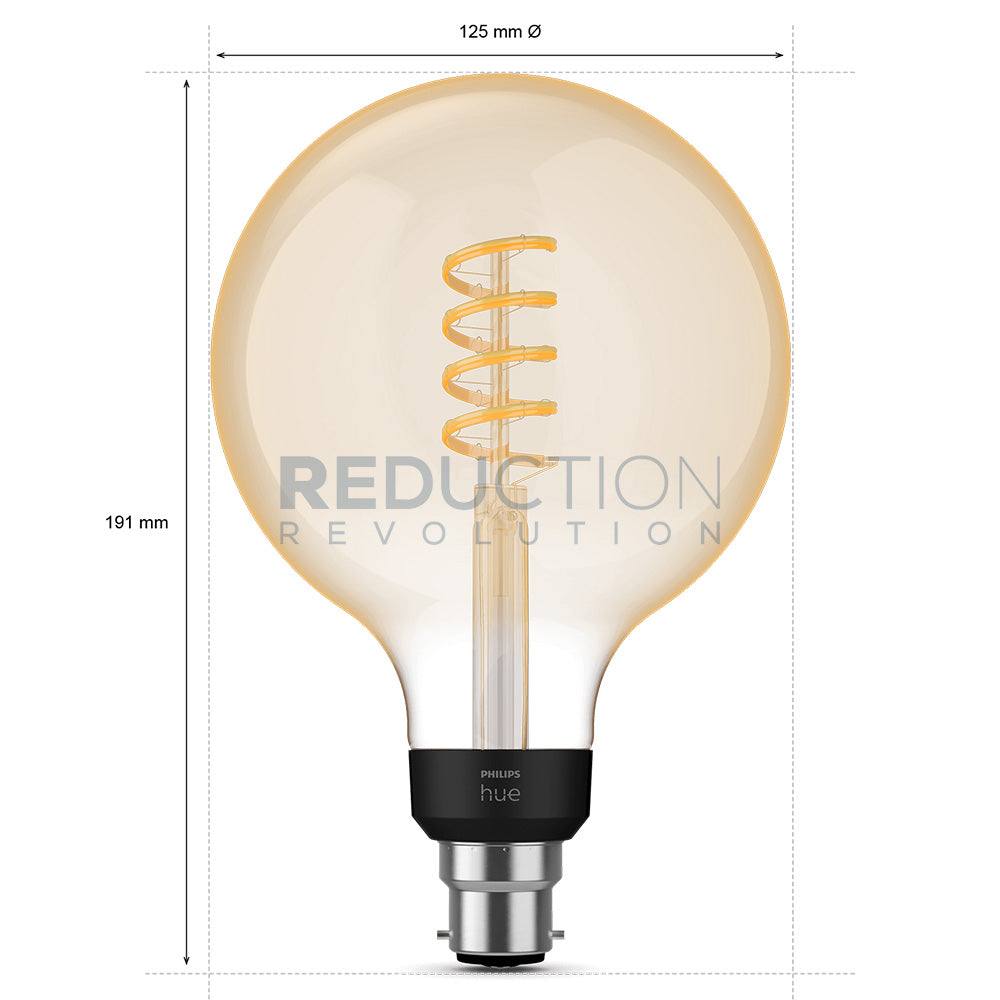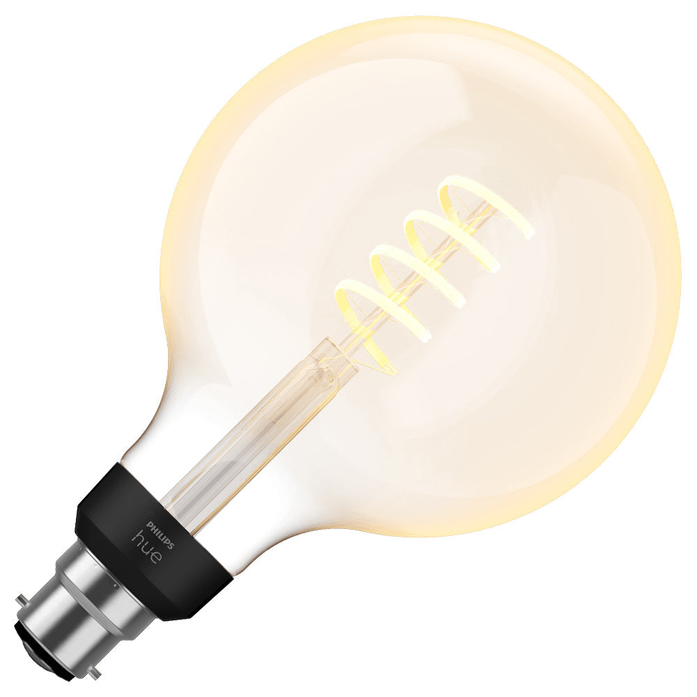 The Philips Hue Filament G125 White Ambiance Bulb is a large round globe that fits Bayonet Cap (B22) light fittings and lamps. It's a modern re-creation of old incandescent filament lights. It connects to your phone via Bluetooth, or you can add it to your lighting system with a Philips Hue Bridge.