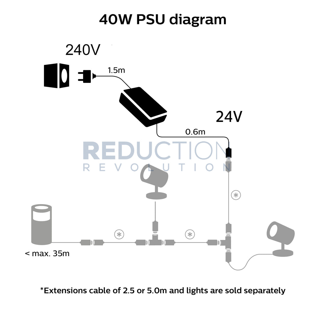 Check the wattage on the box of your lights (e.g., a Lily Spot is 8W). Add the wattages of all lights you want to connect to the PSU. If the total is under 40W, use the 40W PSU. If it is over 40W, you need the 100W PSU or divide the lights into multiple strings, each with its own PSU.