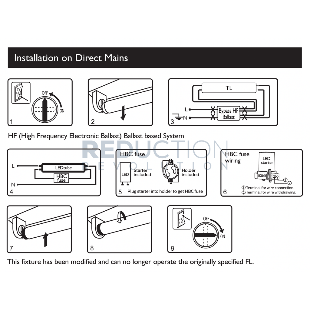 Your electrician will need to 'wire out' the existing high-frequency electronic ballast and fit an in-line starter (safety fuse). Here's a step-by-step guide to the process: